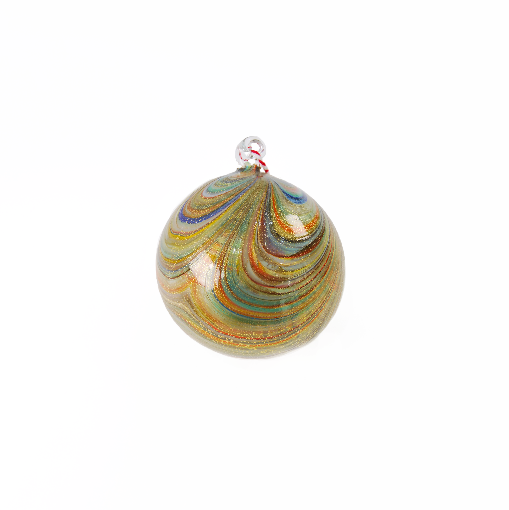 An elegant and luminous Christmas ornament, handcrafted by Murano glass masters. Its spherical shape and colorful decorative patterns capture the light, adding a festive and refined touch to any setting.
