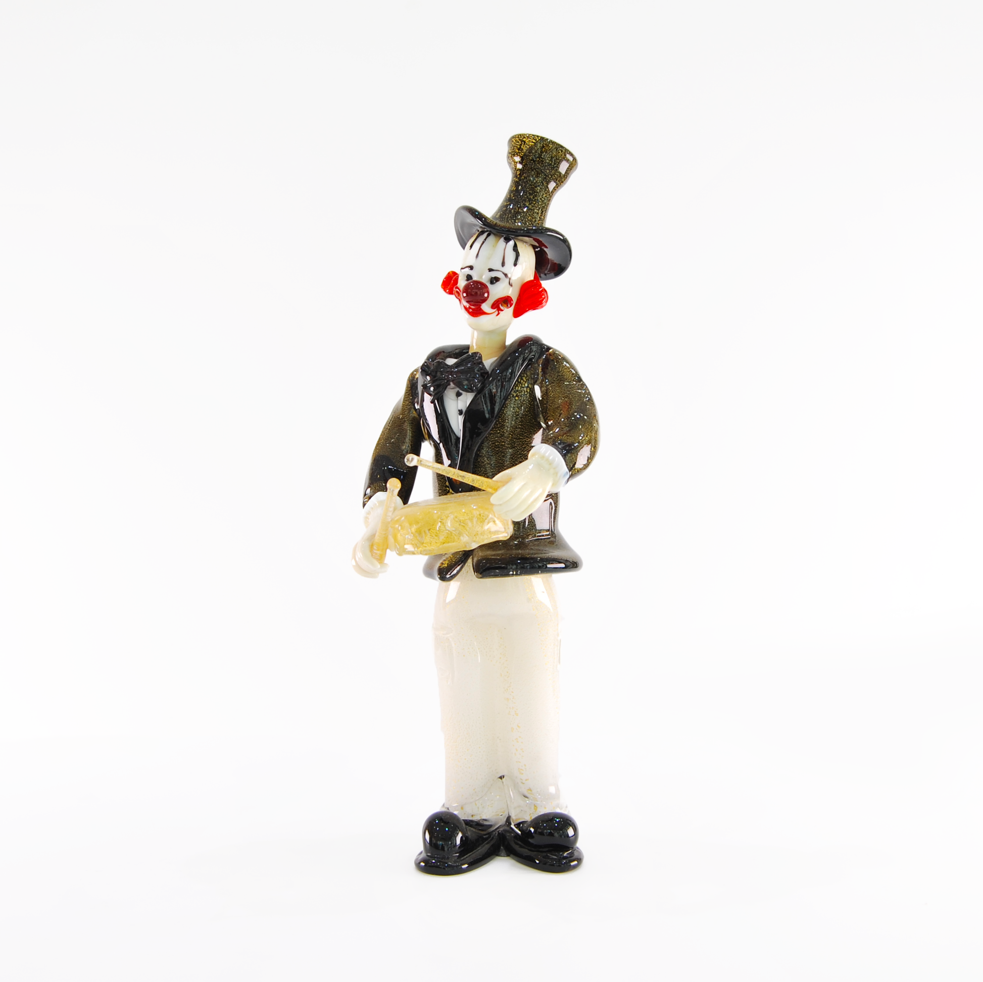 A compact and rhythmic piece, “Clown Playing Tambourine” is a Murano glass sculpture, part of the Pagliacci Collection. The stylized figure depicts a clown mid-performance, wearing a black top hat, an elegant black and white outfit, and holding a golden tambourine played with two sticks.