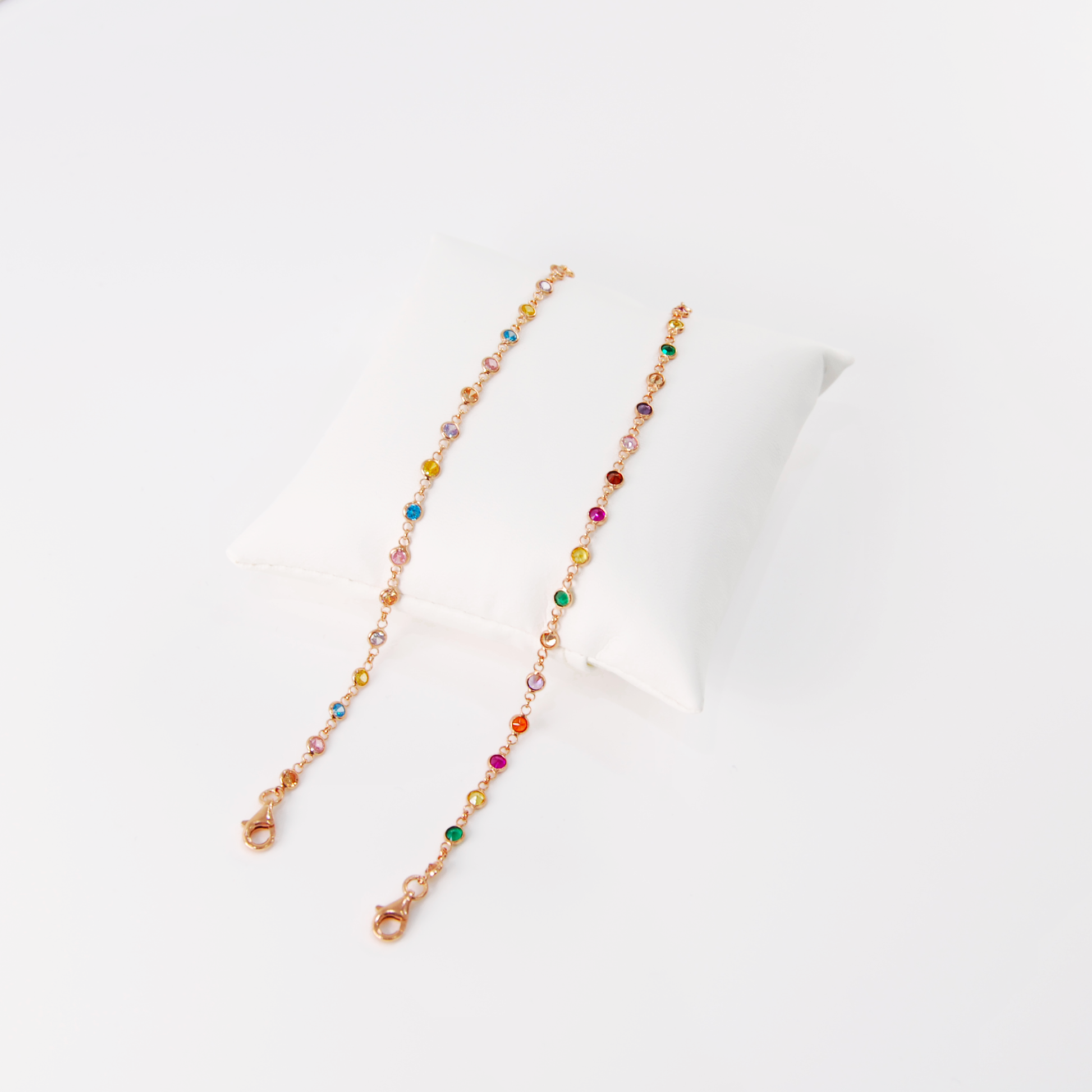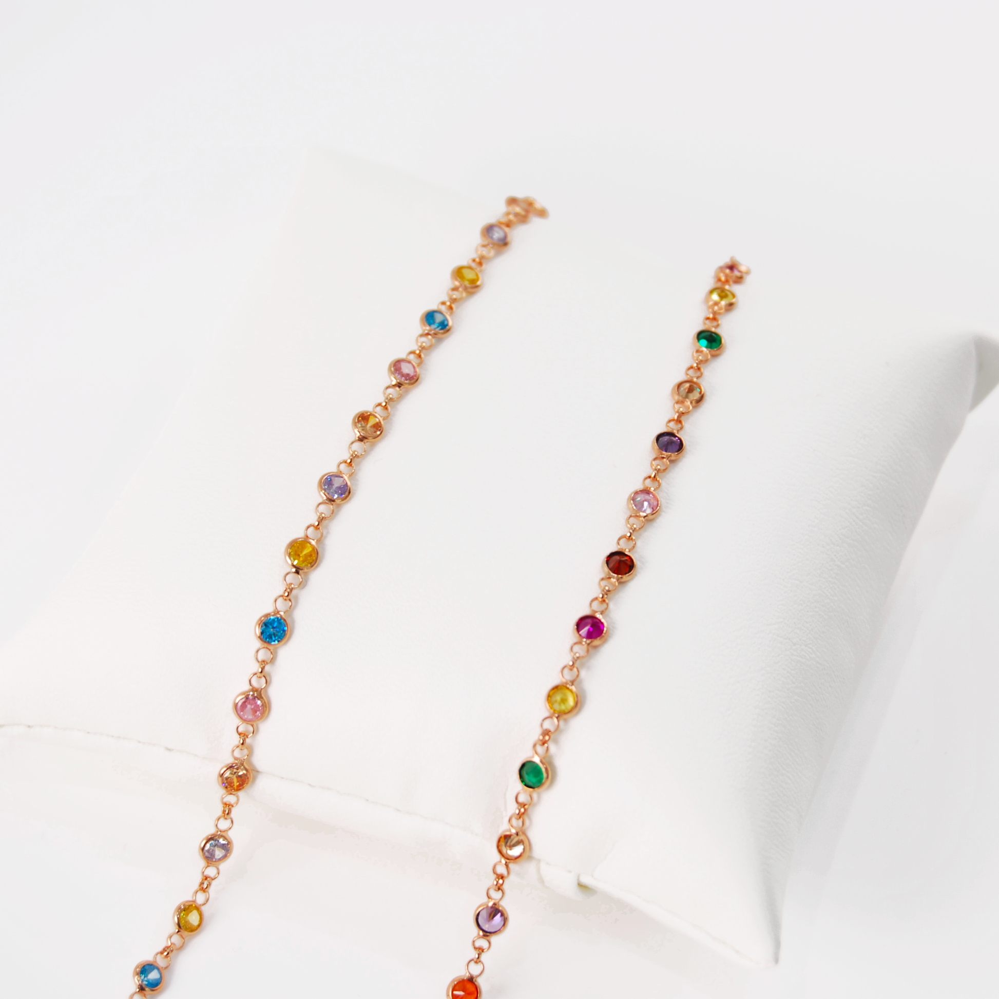 A whisper of color flowing lightly. Tiny faceted Murano glass stones are delicately spaced along a fine chain, creating a lively and luminous rhythm. Essential yet vibrant, this bracelet adds a refined touch of color to every gesture. Perfect worn alone or layered for a richer effect.