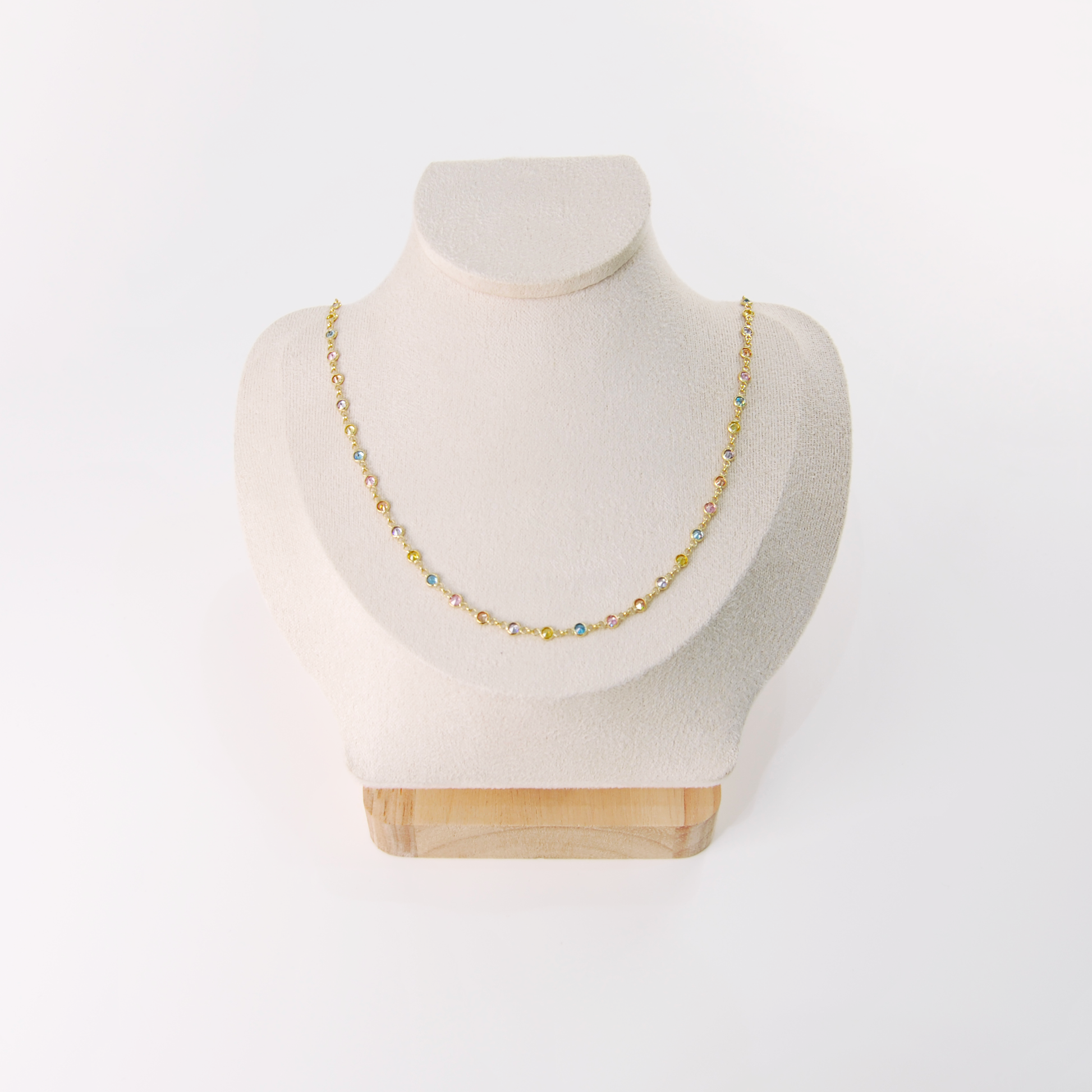 A touch of color gently brushing the neckline. Tiny faceted Murano glass stones — rose, amethyst, green, blue, and crystal — alternate along a fine gold‑tone chain, creating a lively and luminous rhythm. Essential yet vibrant, this necklace adds a playful note of elegance to any look.