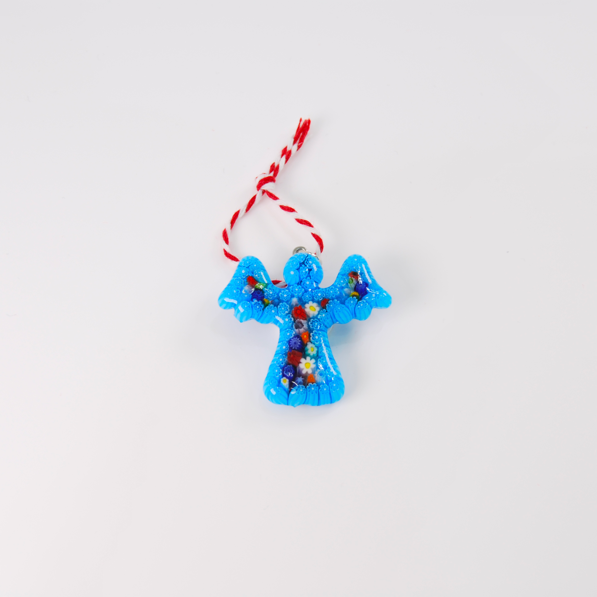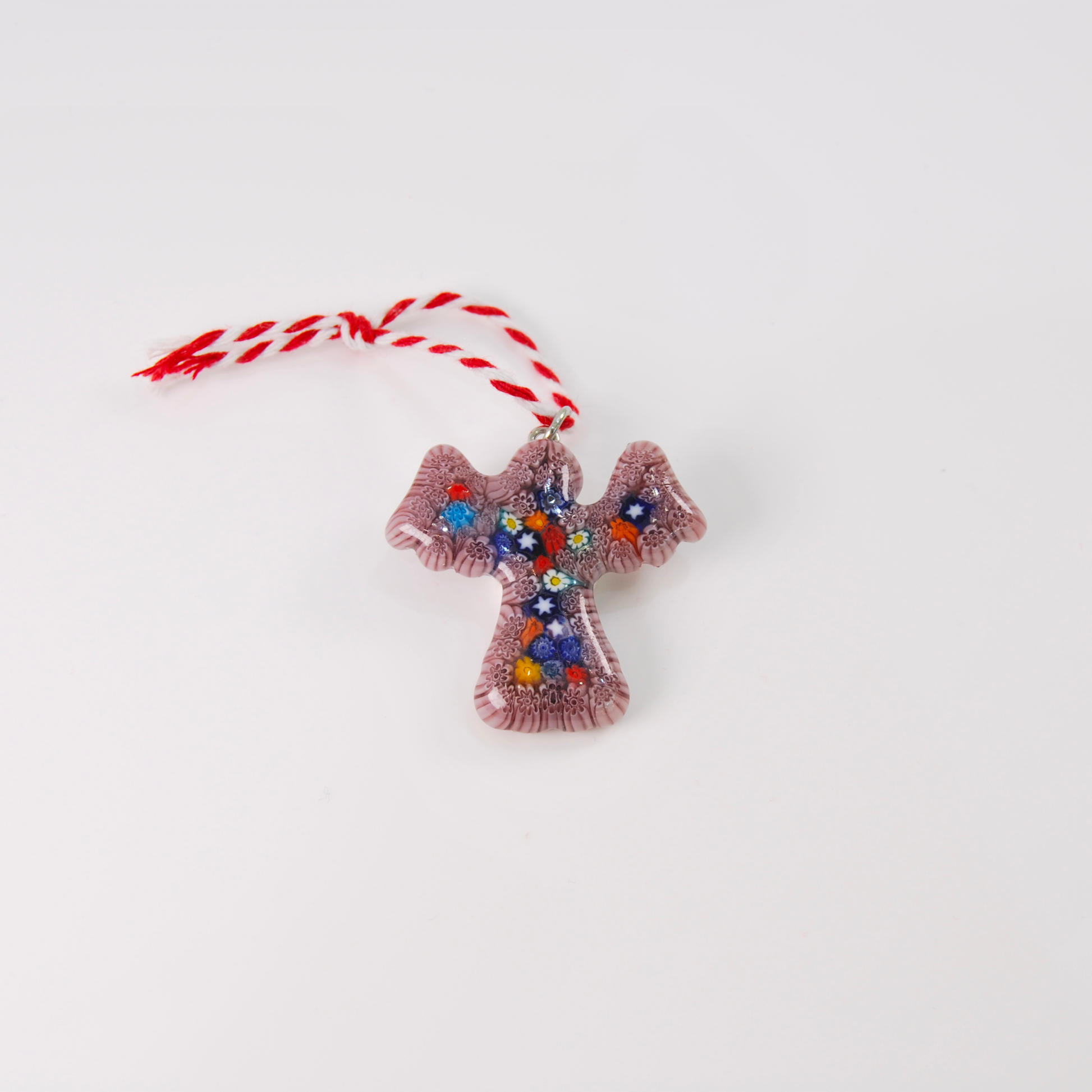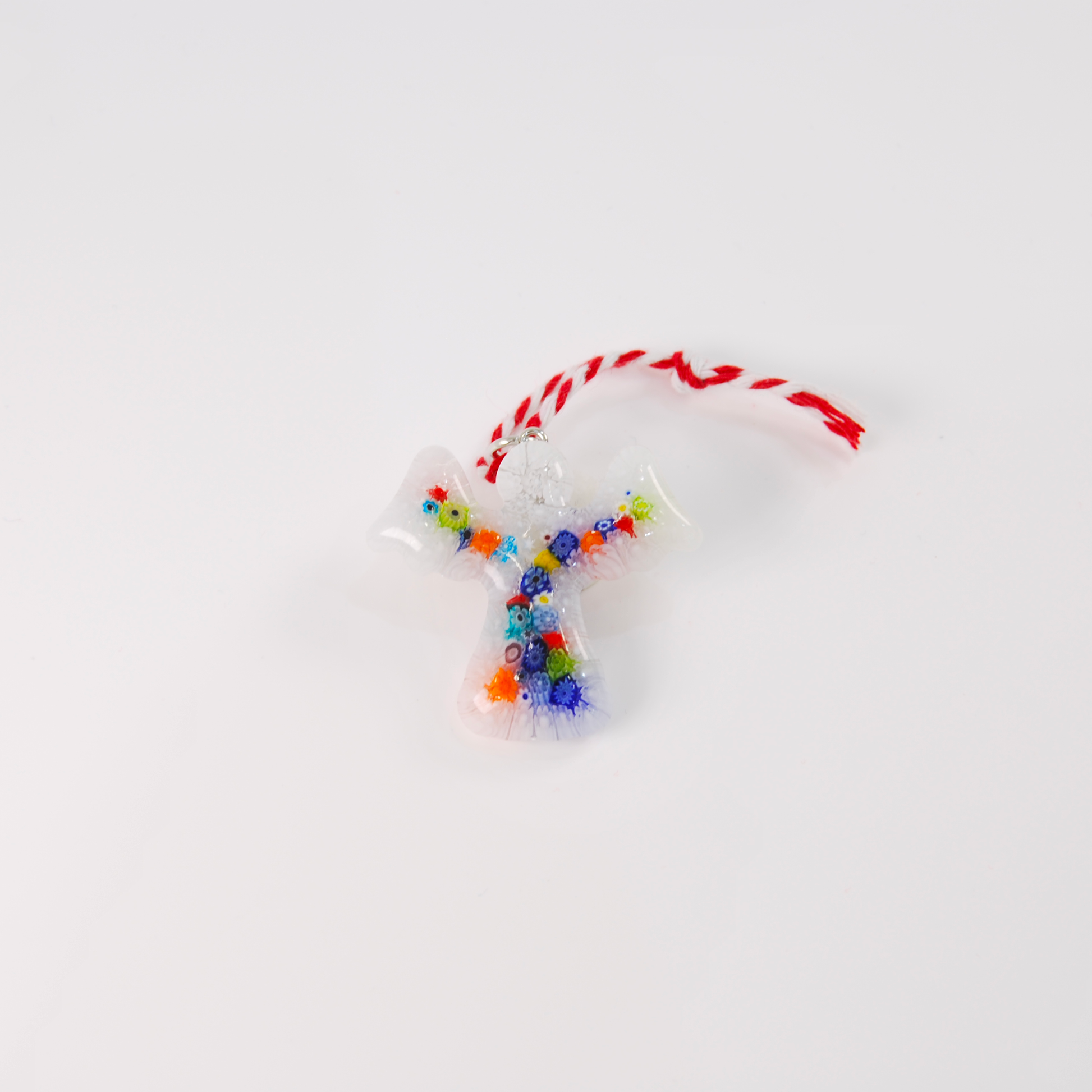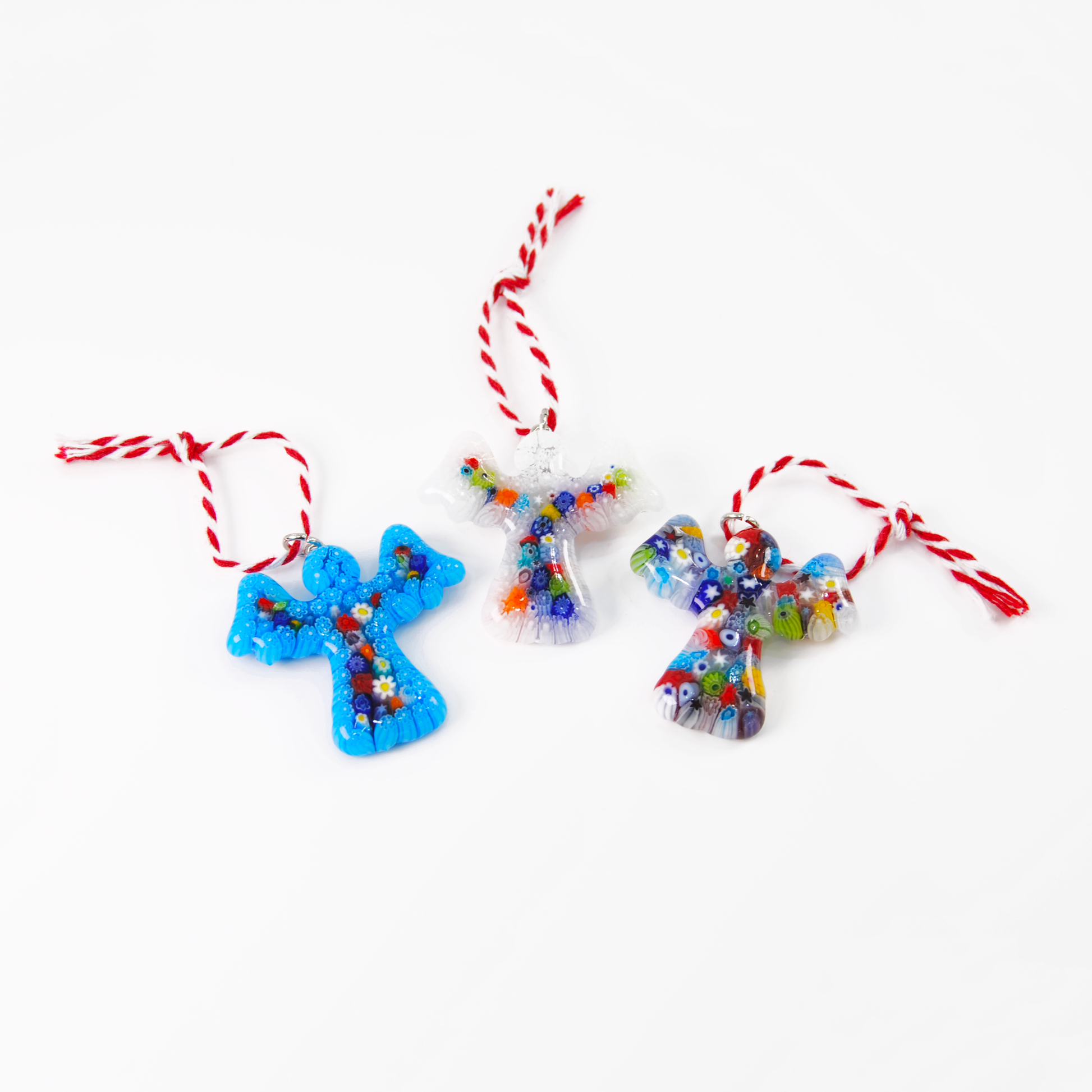 Graceful and luminous, the “Little Murrina Angels” are Christmas ornaments handmade from authentic Murano glass, adorned with fused floral murrine and geometric patterns. Each angel is unique, available in various colors and finished with a red-and-white twisted cord for elegant hanging.