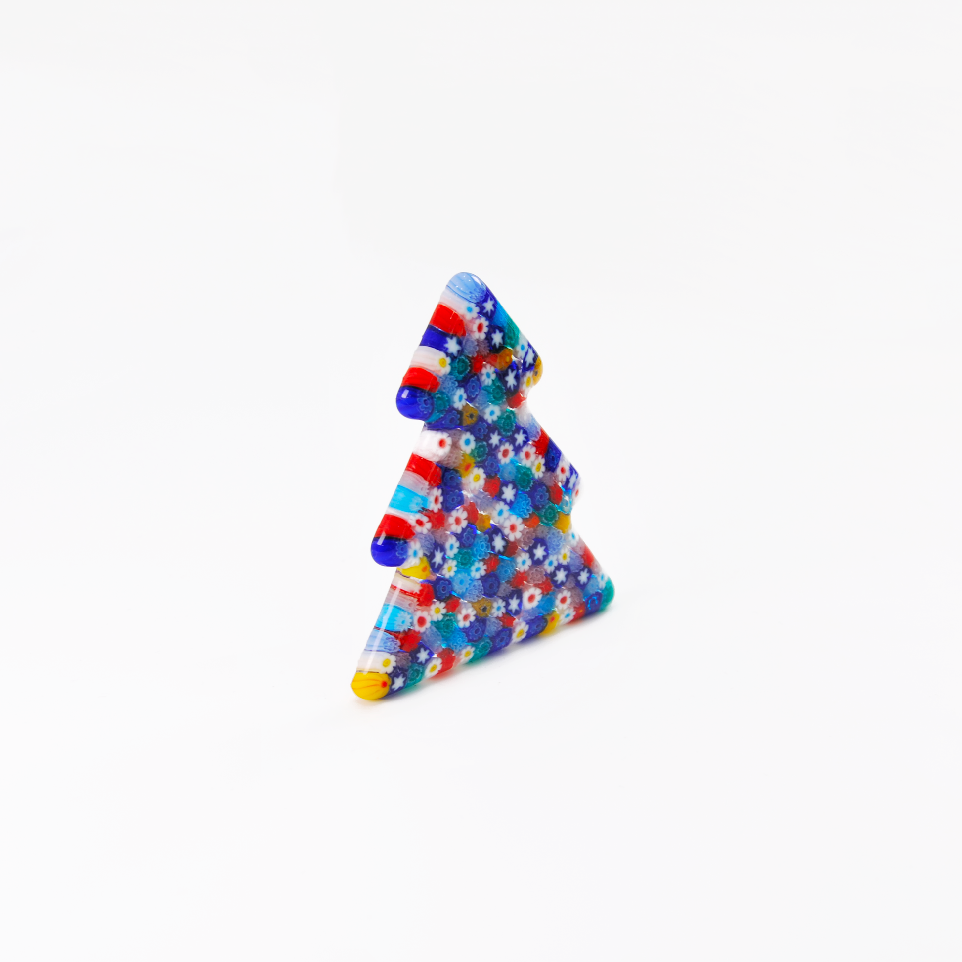 A festive and luminous piece, “Murrina Christmas Tree” is a Murano glass sculpture from the Holiday Collection. The stylized Christmas tree, crafted from translucent glass, is adorned with vibrant floral and mosaic-like patterns in multicolored murrina style, adding brilliance and joy to the composition.