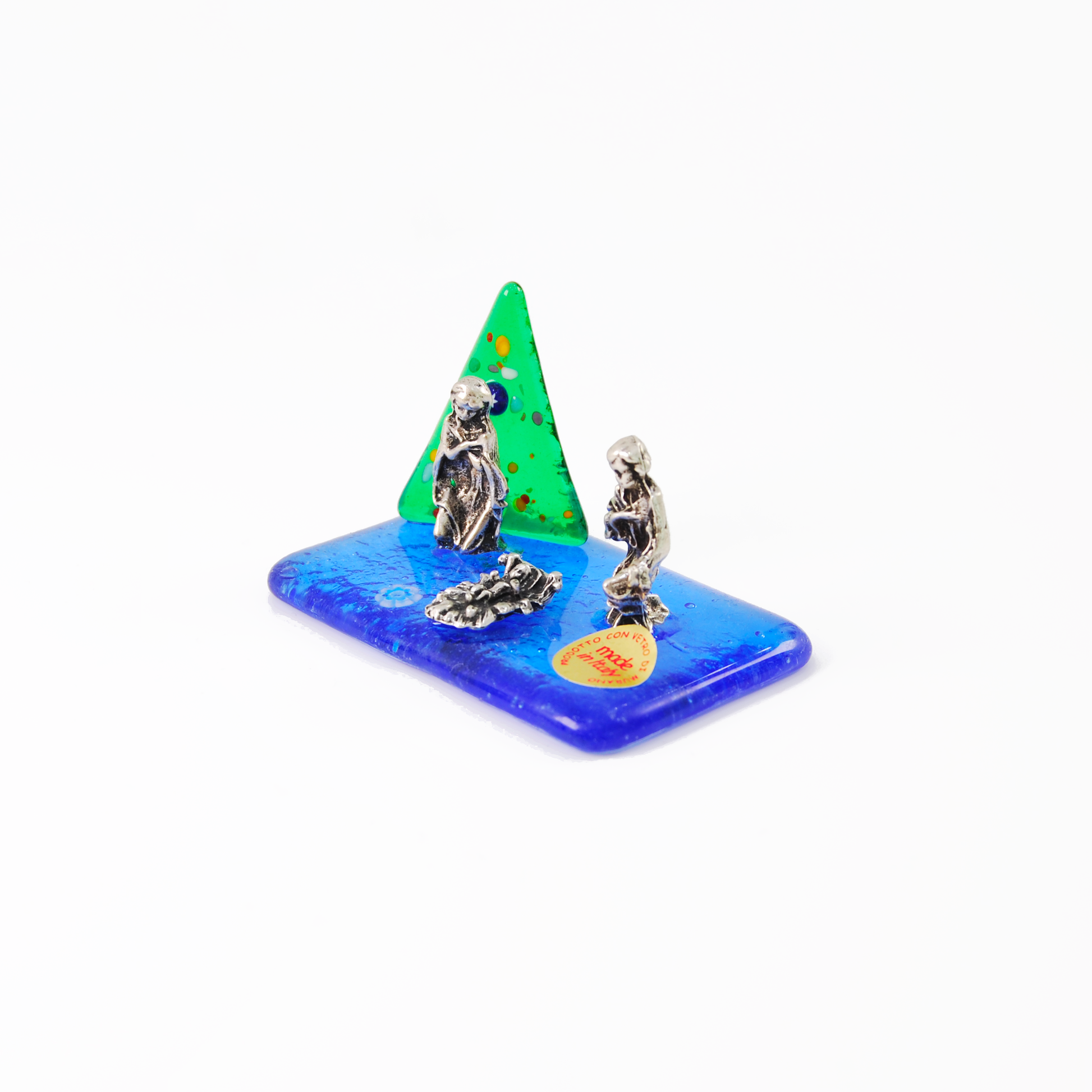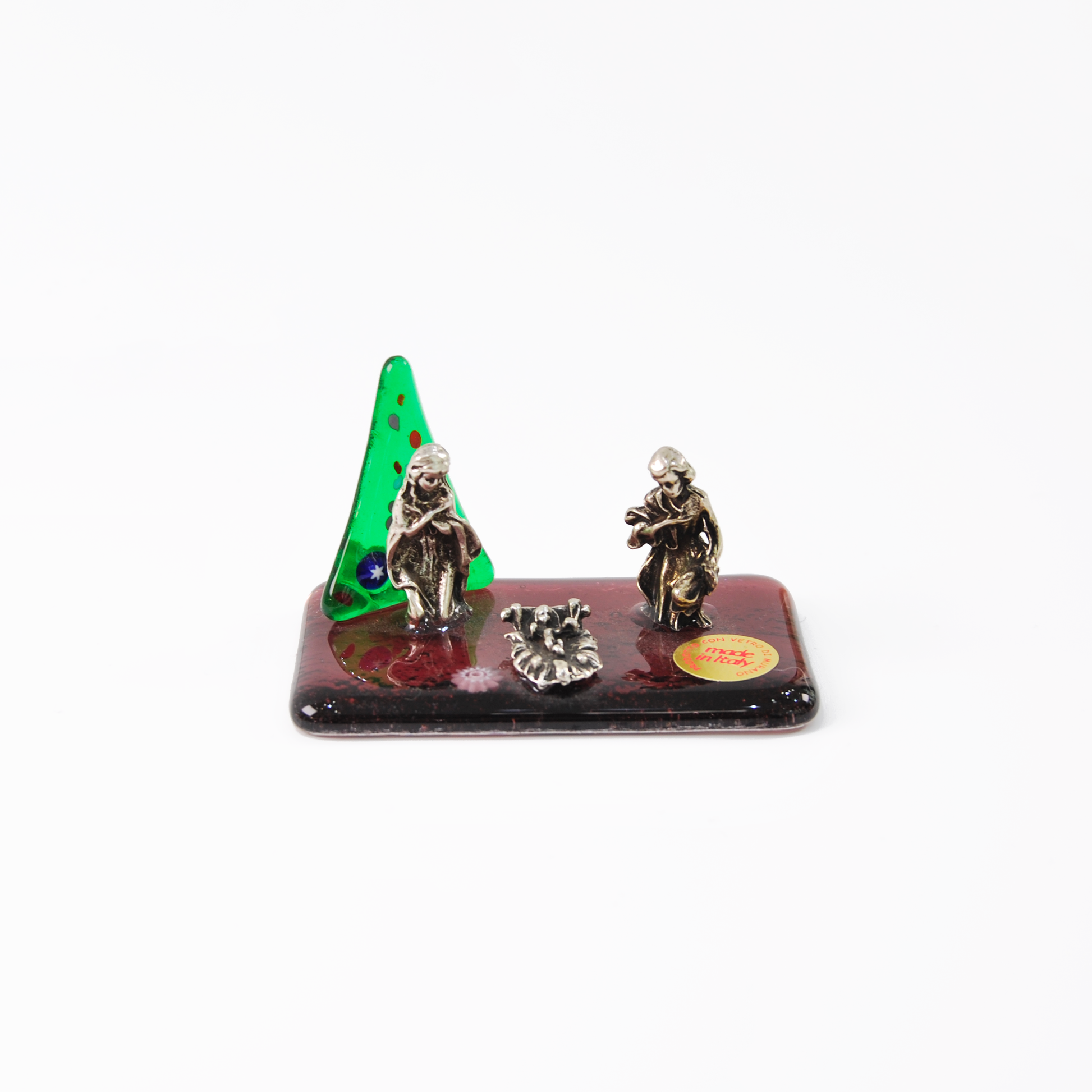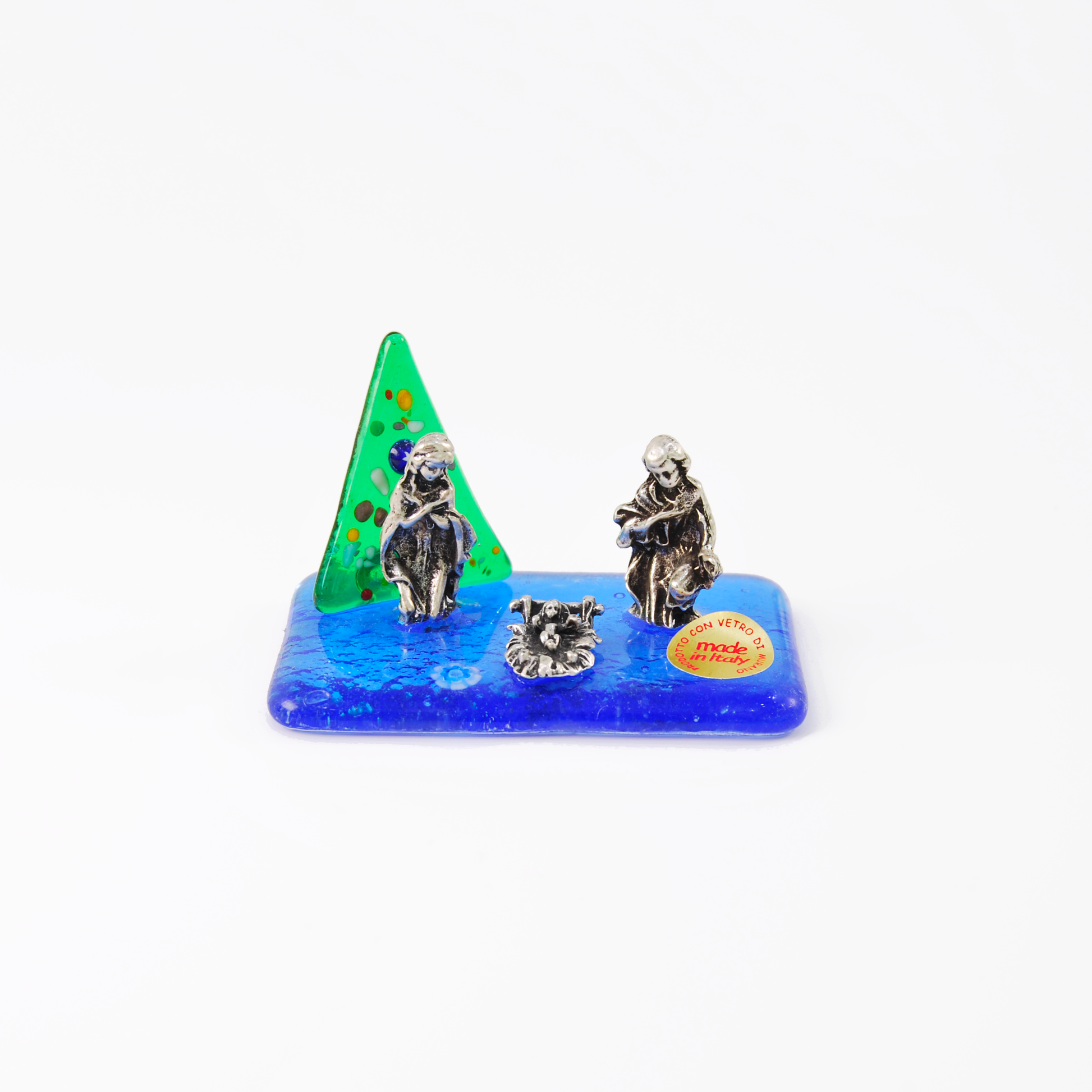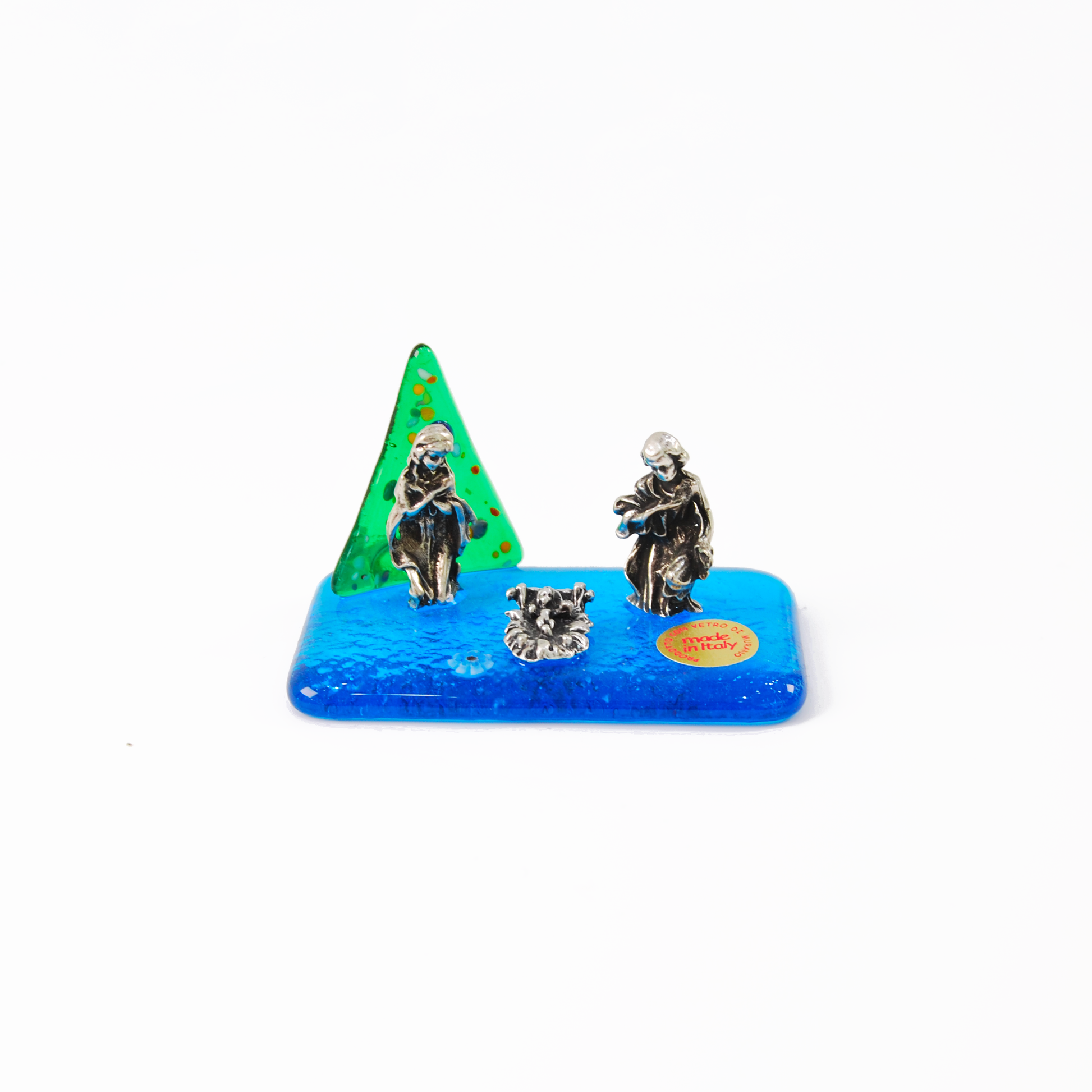 A poetic and contemporary piece, “Nativity with Tree” is a Murano glass sculpture from the Holiday Collection. The composition features stylized metallic figures of Mary, Joseph, and baby Jesus on a blue glass base, framed by a green Christmas tree with red and black accents that adds a festive and modern touch to the sacred scene.