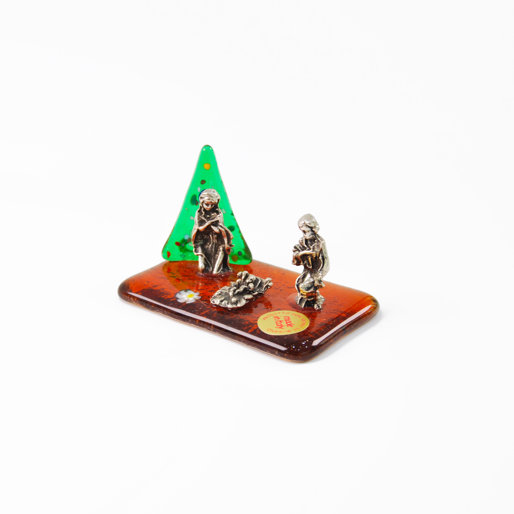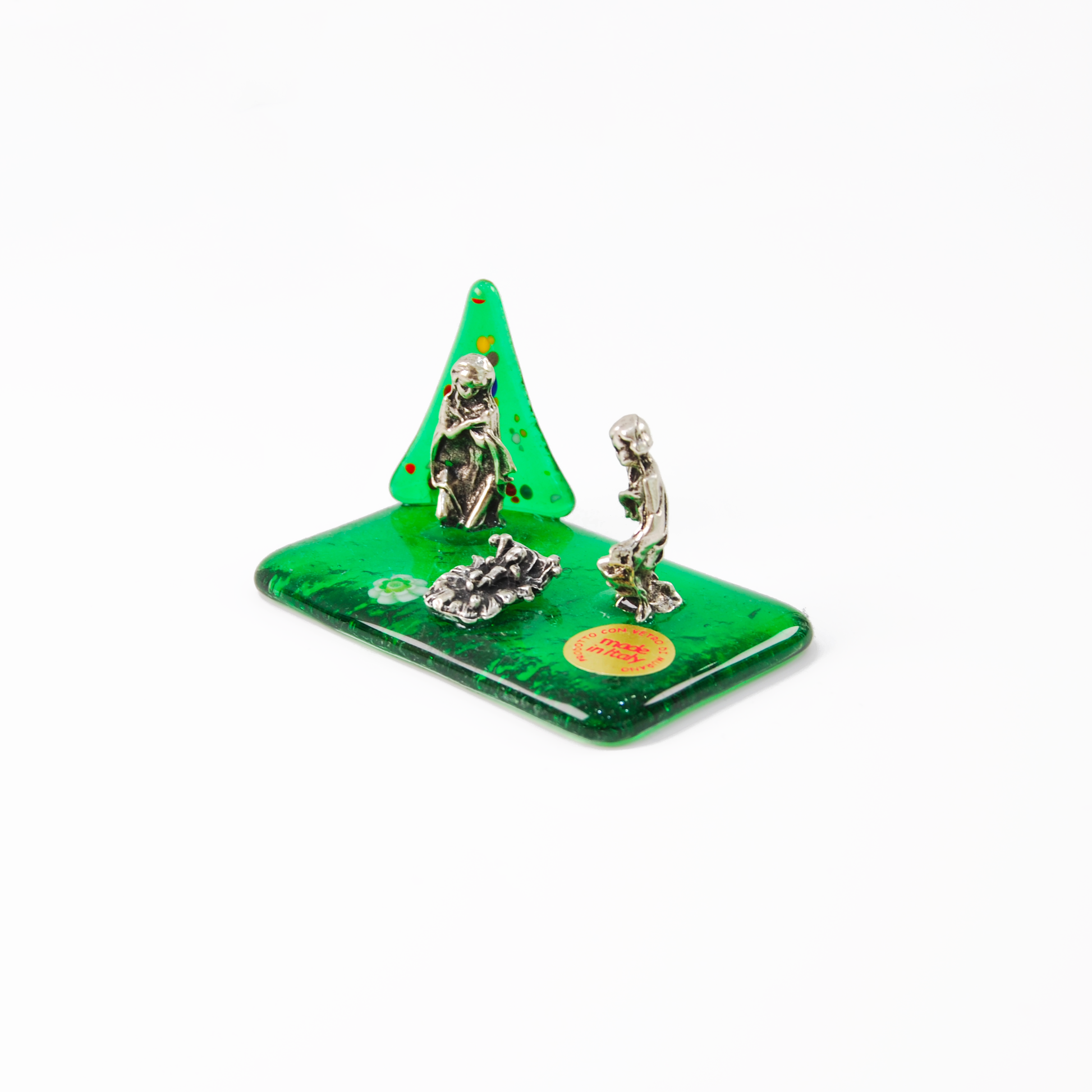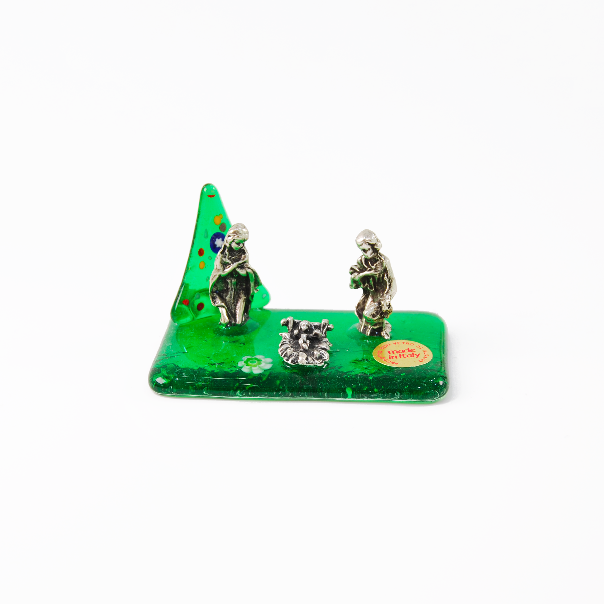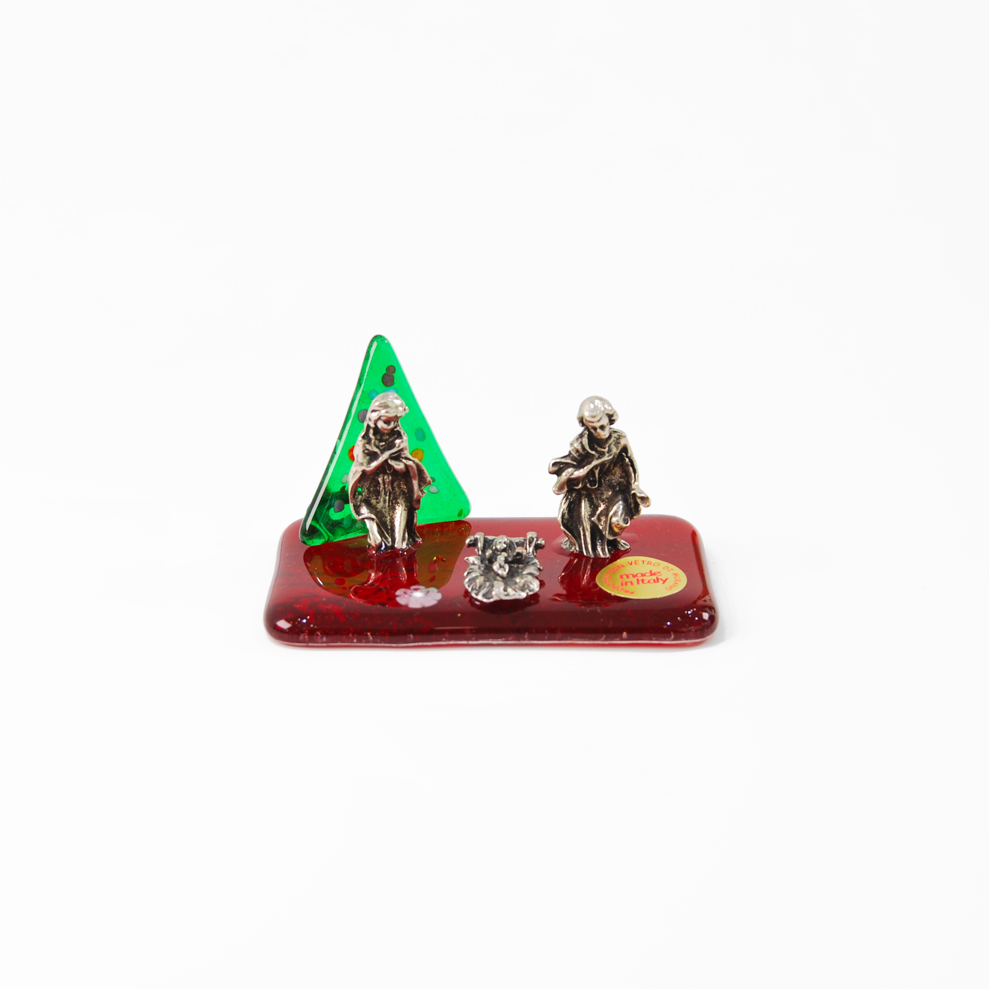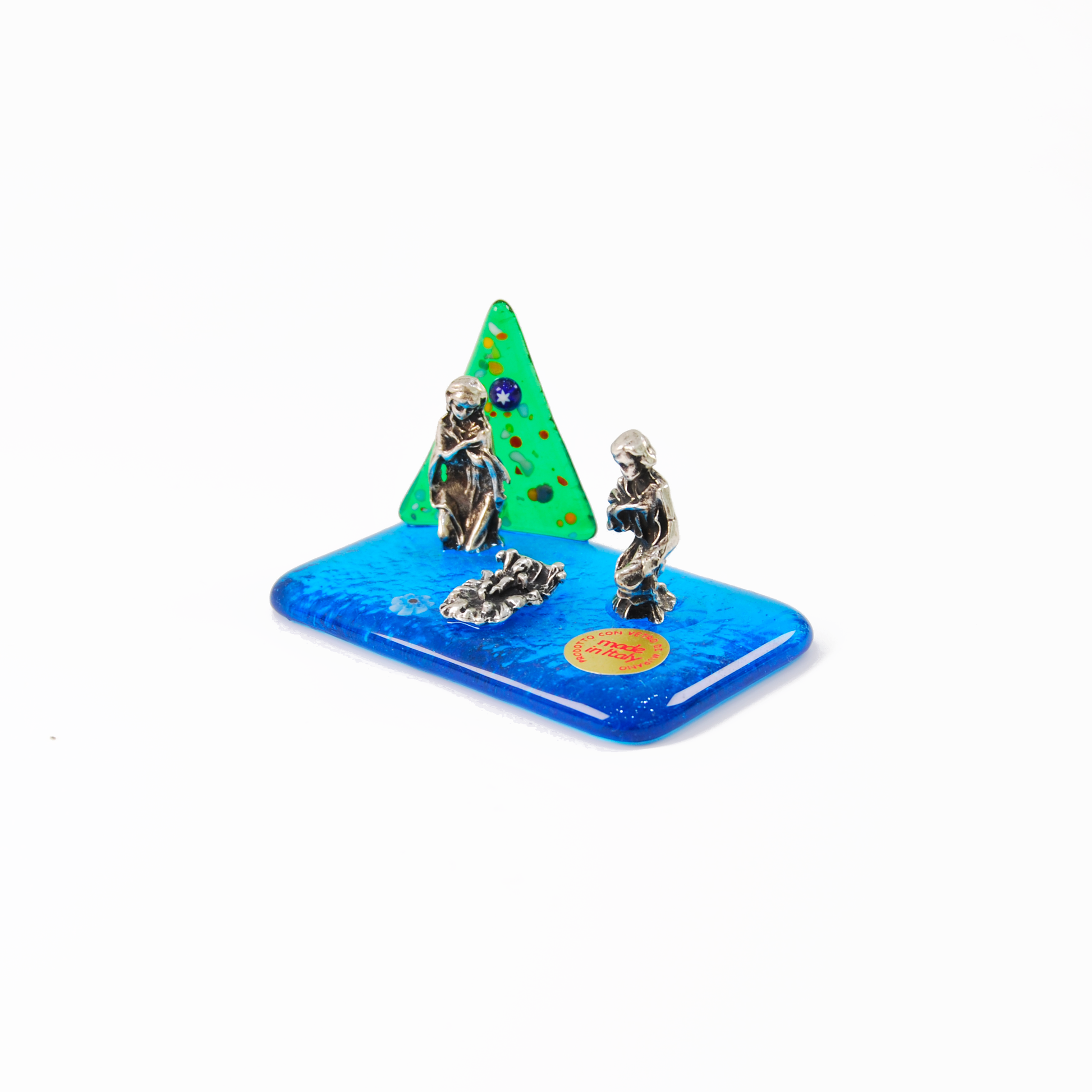 A poetic and contemporary piece, “Nativity with Tree” is a Murano glass sculpture from the Holiday Collection. The composition features stylized metallic figures of Mary, Joseph, and baby Jesus on a blue glass base, framed by a green Christmas tree with red and black accents that adds a festive and modern touch to the sacred scene.