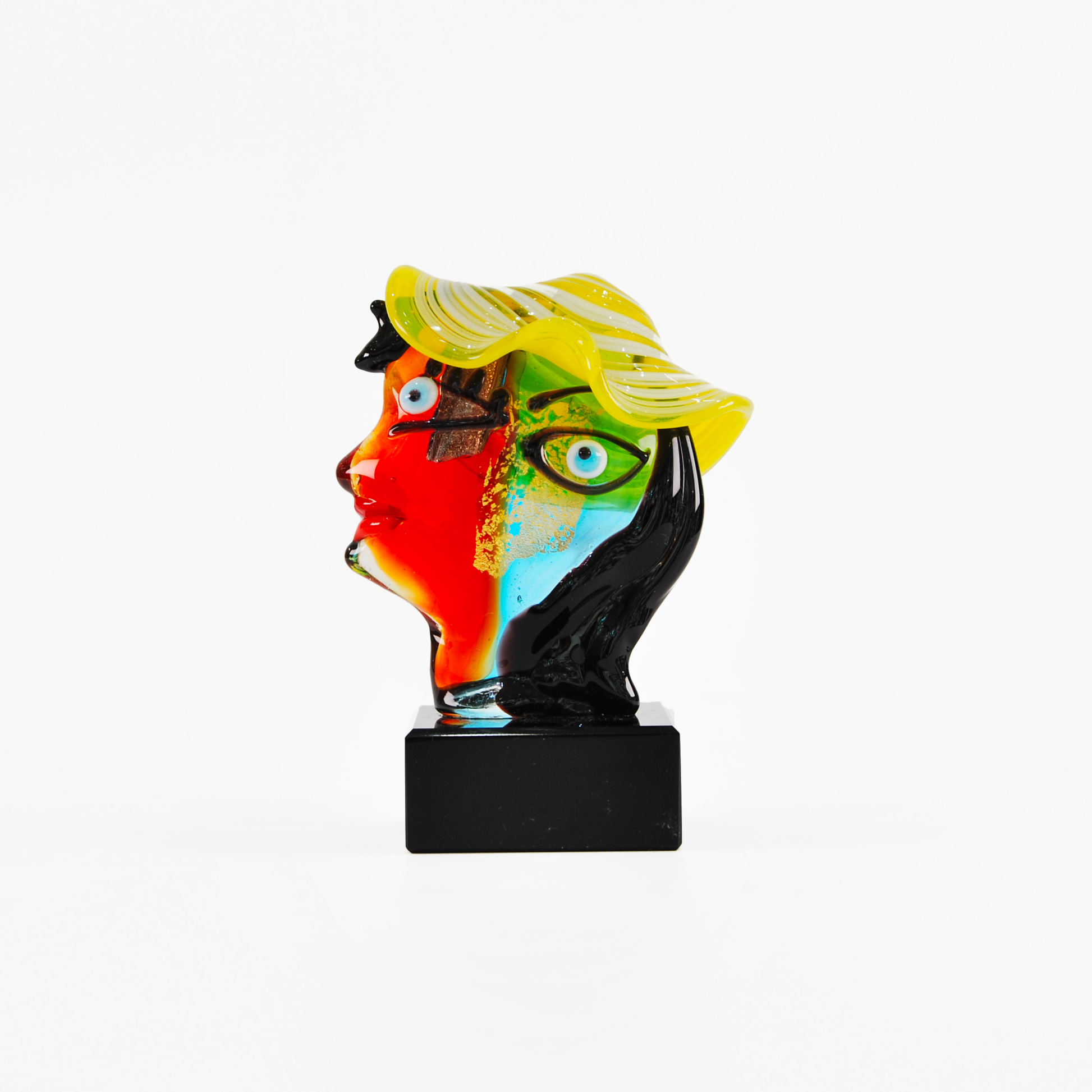 A visually striking piece with vibrant personality: “Red and Light Blue Face with Yellow Hat” is a Murano glass sculpture, part of the imaginative Picasso Collection. The stylized face, split between red and light blue, evokes cubist aesthetics with a pop and contemporary twist.