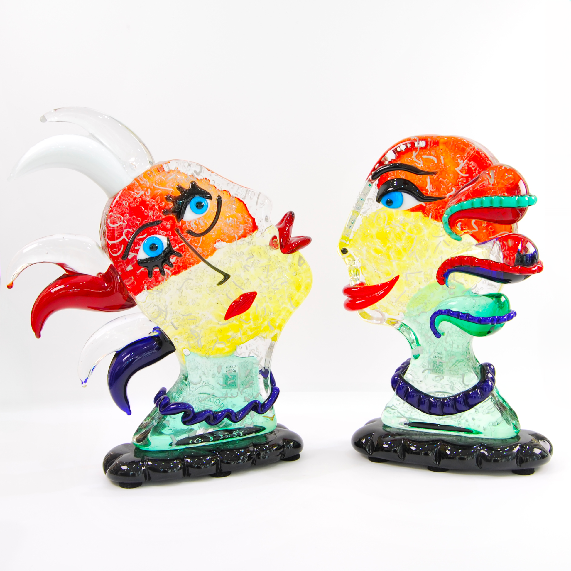 An ironic and vibrant ode to the marine world, part of the whimsical Picasso Collection. This duo of sculptures, crafted entirely from authentic Murano glass, portrays two stylized faces with expressive features and bold colors—evoking sea creatures through a pop and cubist lens.