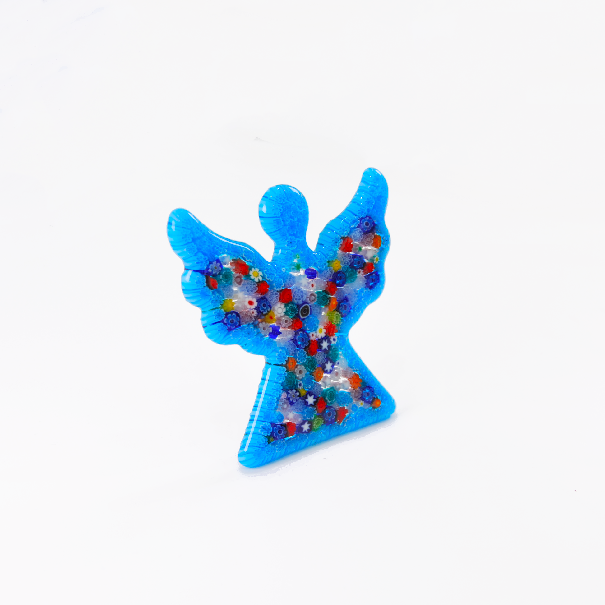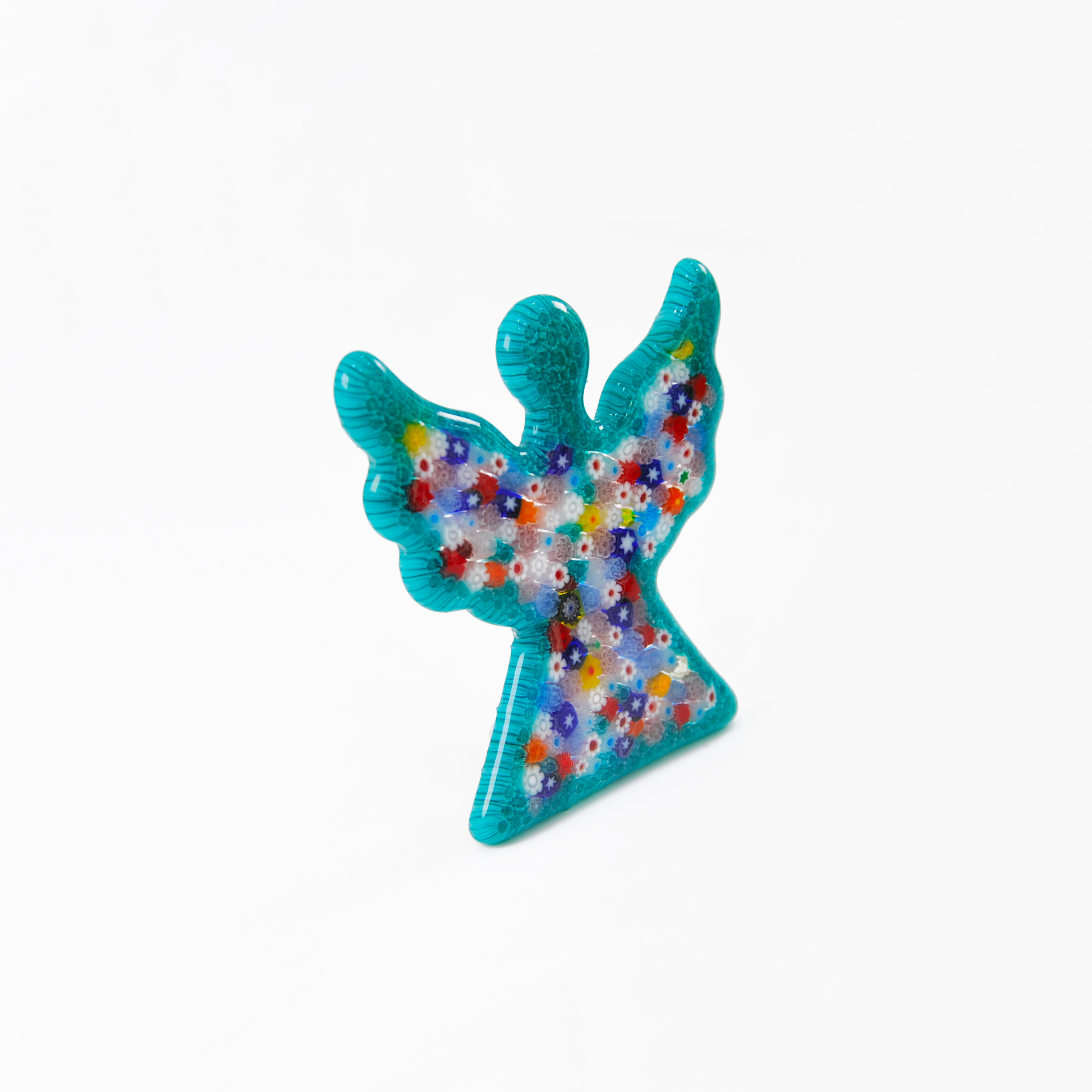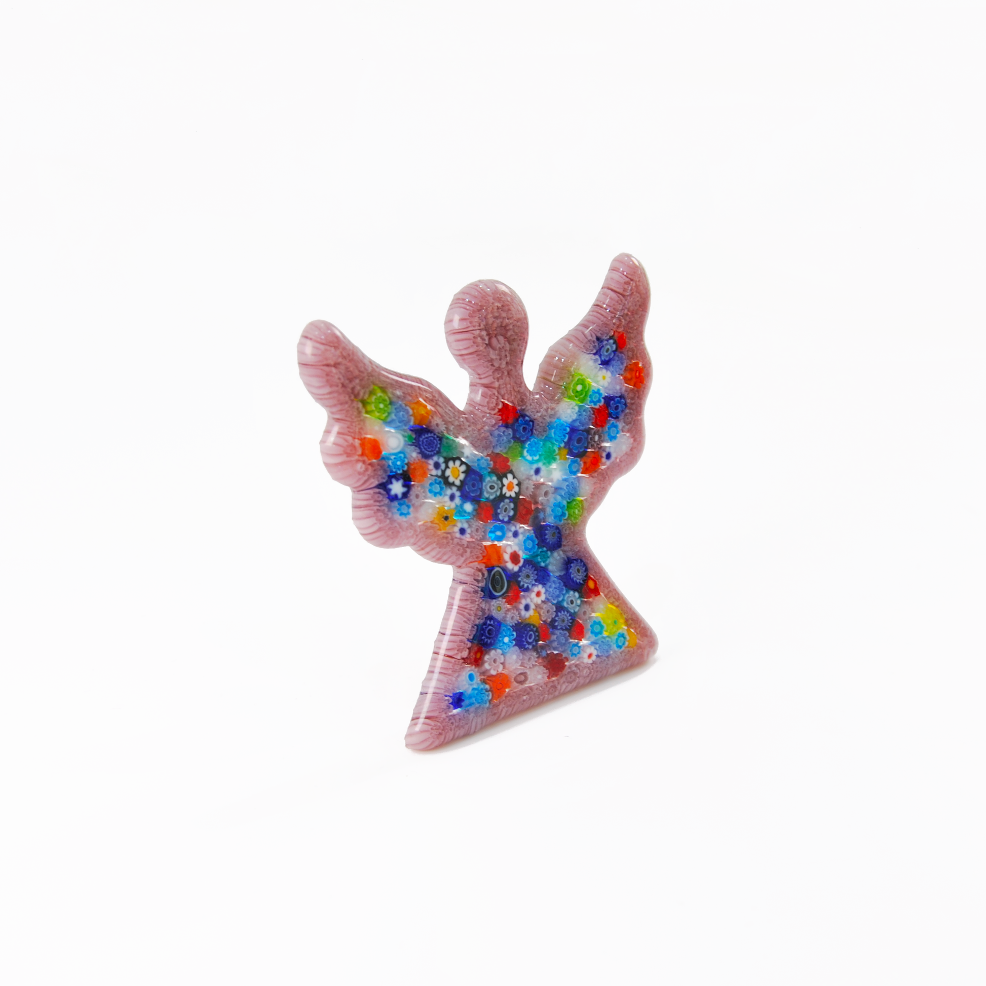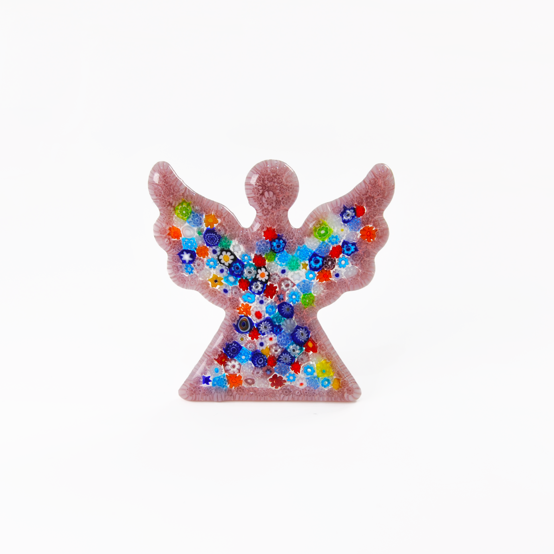 A vibrant and symbolic piece, “Table Angel in Murrina Style” is a Murano glass sculpture from the Holiday Collection. The composition features a stylized angel with raised wings, enriched with multicolored floral and star-like patterns in classic murrina style, creating a luminous and harmonious effect.