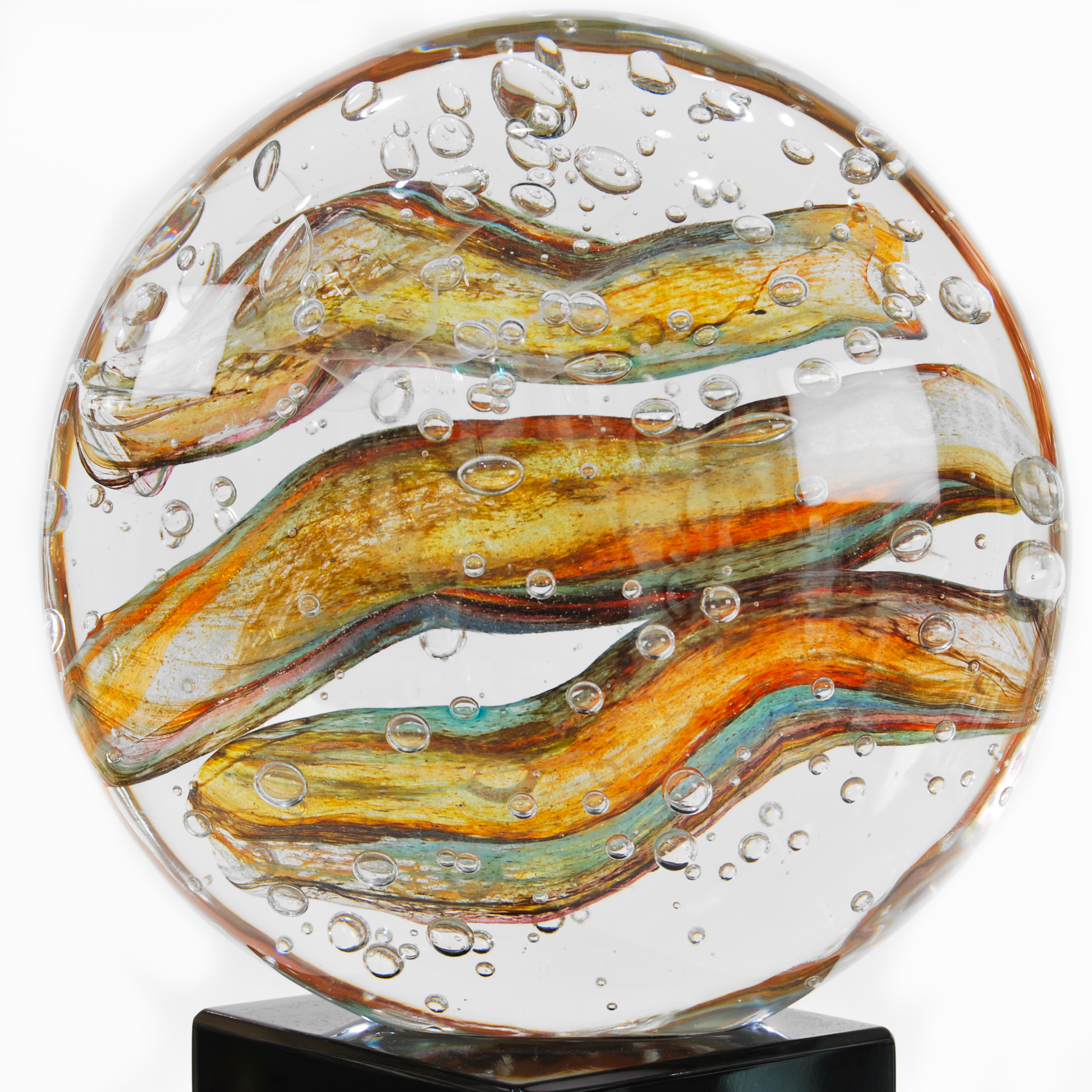A poetic and luminous, part of the evocative Tramonto Collection. Entirely crafted from authentic Murano glass, “Three Waves” is a transparent sphere that encloses three sinuous waves in warm, vibrant hues inspired by the golden light of sunset.